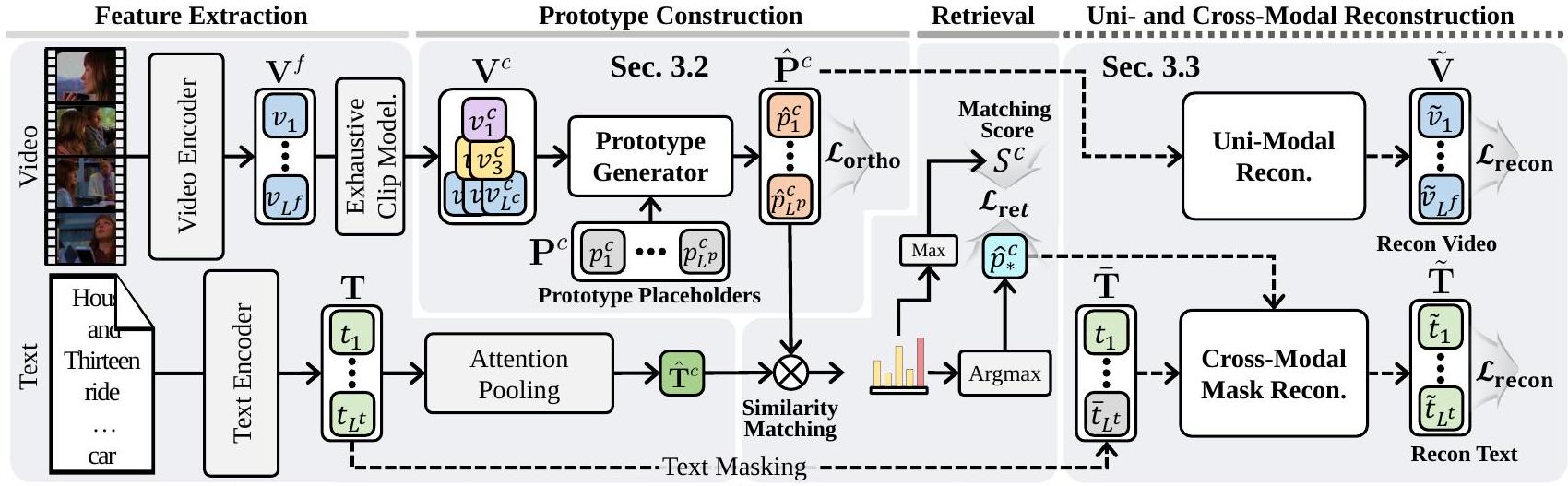 우리의 연구는 PRVR을 위한 **비디오 표현 학습(video representation learning)**으로 prototypical learning을 확장한다. 다음 섹션에서는 프로토타입의 효율성을 활용하기 위한 우리의 아키텍처 설계 선택에 대해 자세히 설명하며, 여기에는 이중 재구성 task, 약한 비디오-텍스트 가이드, 프로토타입 다양화와 같은 개선 사항이 포함된다.