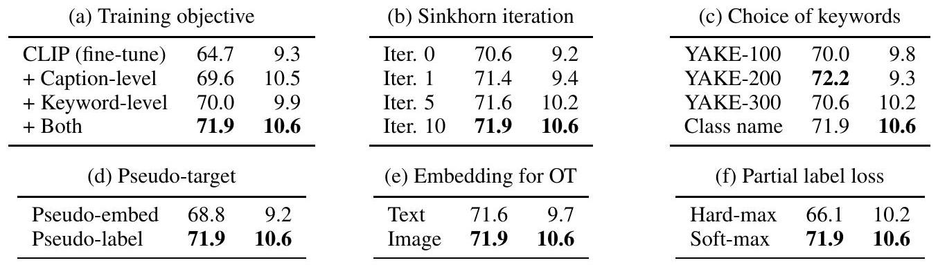 우리는 두 pseudo-label이 상호 보완적이라는 점에 주목한다. 캡션 수준 pseudo-label은 모델이 언어의 전역적 구조를 이해하는 데 도움을 주며, 이는 이미지-텍스트 검색에 더 효과적이다. 키워드 수준 pseudo-label은 모델이 지역적 구문(local phrases)을 이해하는 데 도움을 주며, 이는 zero-shot 분류에 더 효과적이다. 이들을 결합하면 두 가지 장점을 모두 얻을 수 있다 (Section 5.5).