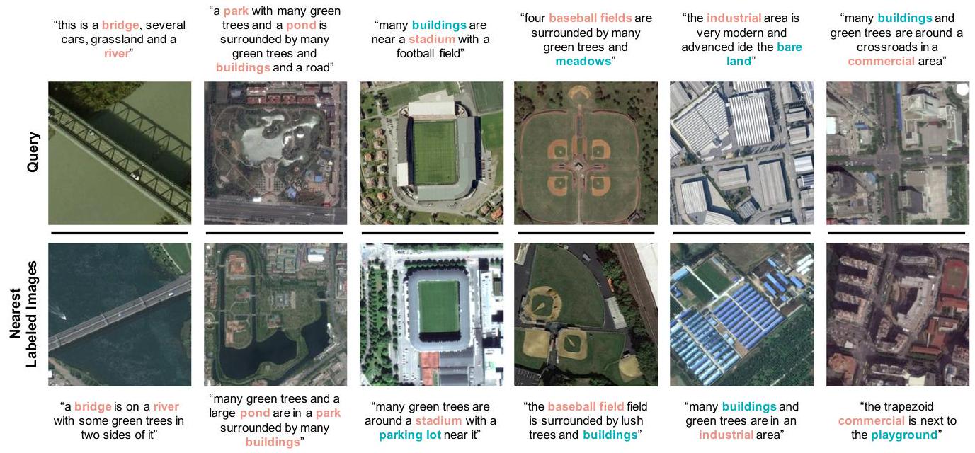 zero-shot classification의 경우, 우리는 RSICD 및 UCM 데이터셋의 분류 버전인 RSCID-CLS 및 UCM-CLS의 validation set을 사용한다. 일반화 능력을 평가하기 위해, 우리는 WHU-RS19 [31], RSSCN7 [80], AID [81]와 같은 unseen 데이터셋에서 모델을 테스트한다. image-text retrieval의 경우, 우리는 RSICD, UCM, Sydney 데이터셋의 validation set을 사용한다.