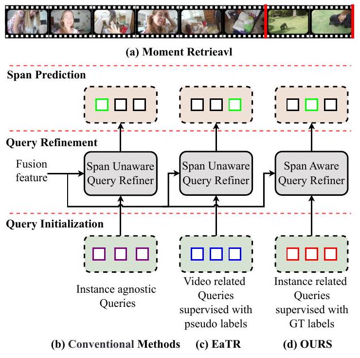 Figure 1: (a) Moment Retrieval. (b)(c)(d) 다양한 방법들 간의 Query Initialization 및 Query Refinement 차이.