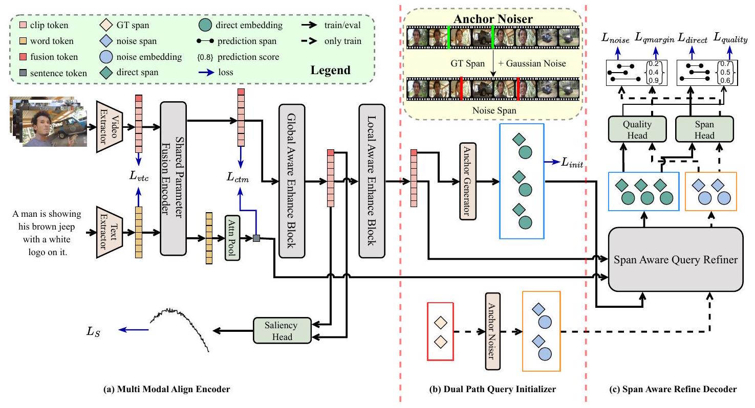 - Dual Path Query Initializer: 기존 학습 가능한 파라미터 대신 비디오-텍스트 쌍을 기반으로 span anchor를 생성하고 GT(Ground Truth) label로 지도 학습한다. 또한, denoise learning을 통합하여 노이즈가 있는 Query 그룹을 통해 모델의 span 인지 능력을 향상시킨다.