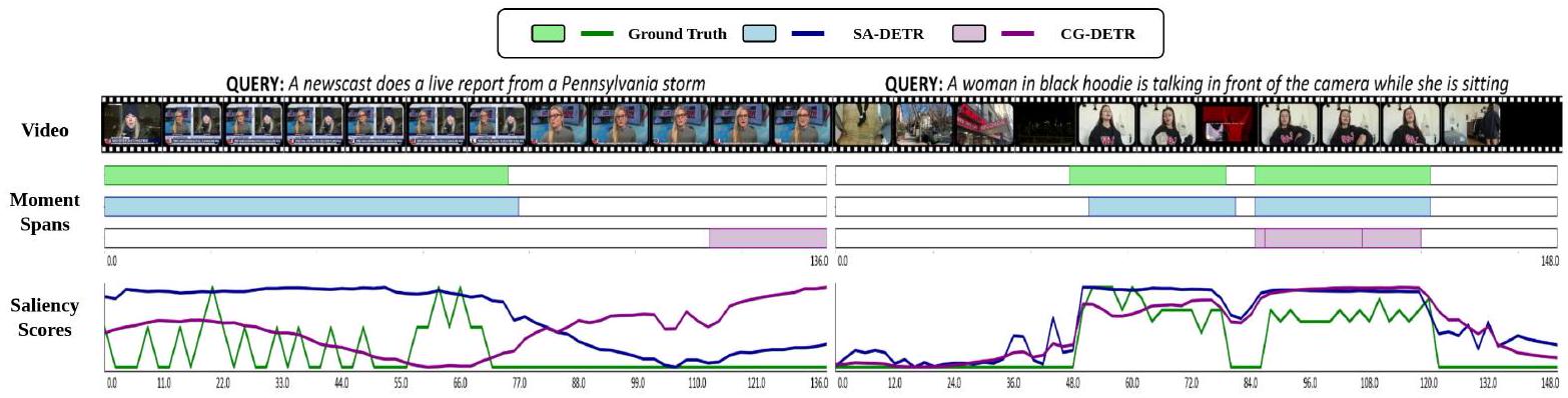 Figure 4에서 볼 수 있듯이, 우리는 예측 결과를 CG-DETR과 비교한다. 왼쪽 사례에서 우리 방법은 텍스트와 관련된 세그먼트를 정확하게 결정하고 올바른 saliency score를 얻을 수 있다. 오른쪽 사례에서 우리 방법은 반복적이고 복잡한 세그먼트를 중복 없이 성공적으로 찾아낸다.