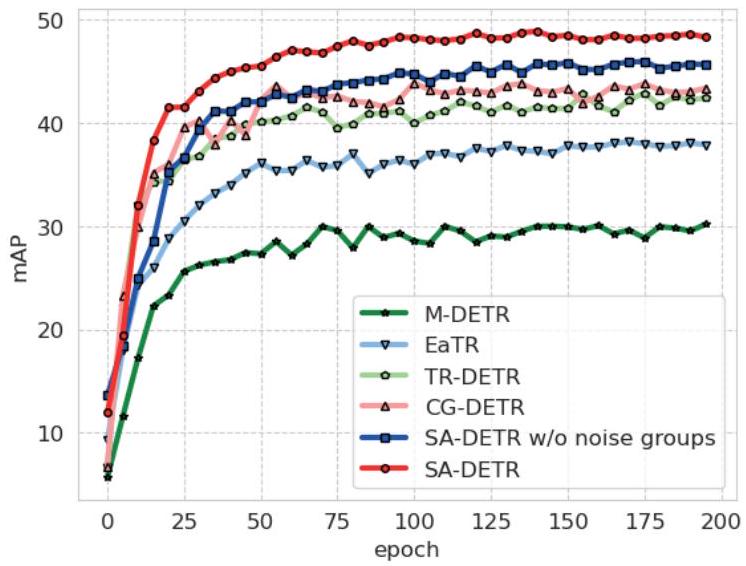 우리는 QVHighlights 데이터셋에서 다른 방법들과의 수렴 속도 및 품질을 비교하고 val split에서의 mAP를 보고한다. Figure 5에서 보듯이, denoise learning을 사용하지 않을 때 모델의 성능은 다른 방법들을 능가하지만, SA-DETR의 초기 수렴은 다른 모델들과 유사하다. denoise learning을 추가하면 모델의 수렴 속도와 품질이 크게 향상된다.