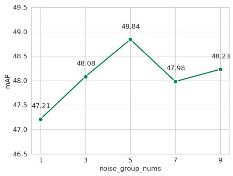 우리는 denoise learning에서 노이즈 그룹 수가 QVHighlights 성능에 미치는 영향을 조사했다. Figure 6에서 볼 수 있듯이, 노이즈 그룹 수가 적을 때는 모델이 충분한 추가적인 supervisory information을 얻지 못한다. 반대로, 노이즈 그룹 수가 많을 때는 지속적인 노이즈가 모델의 수렴에 영향을 미치고 원래의 학습 경로를 방해한다. 경험적 증거에 따르면, 노이즈 그룹 수를 5로 설정했을 때 모델이 최적의 성능을 보인다.