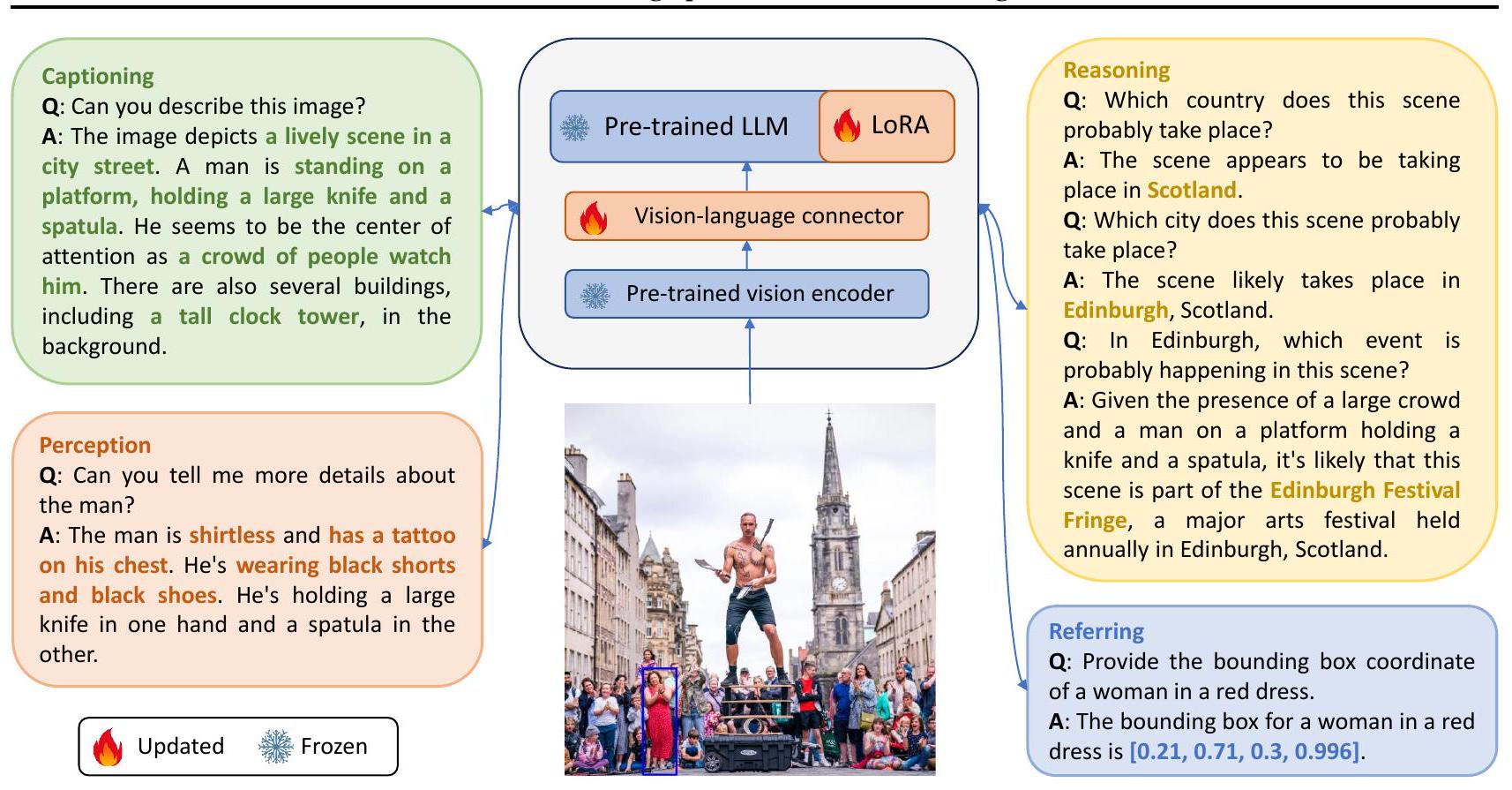 Figure 1. SVIT-v1.5 (LoRA) 모델 아키텍처 및 능력.