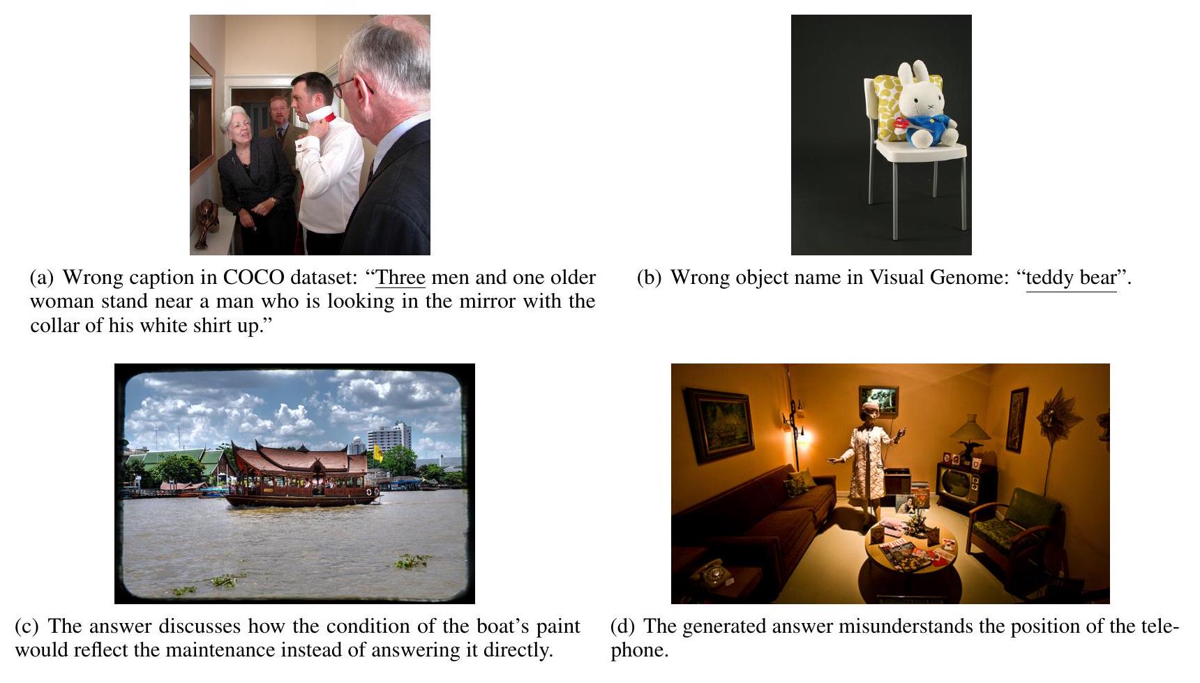 - 원본 어노테이션의 오류 전파: Visual Genome 및 COCO와 같은 원본 데이터셋의 수동 어노테이션에 오류가 있을 경우, GPT-4가 이를 기반으로 생성한 데이터에도 오류가 전파될 수 있다는 한계가 있습니다.