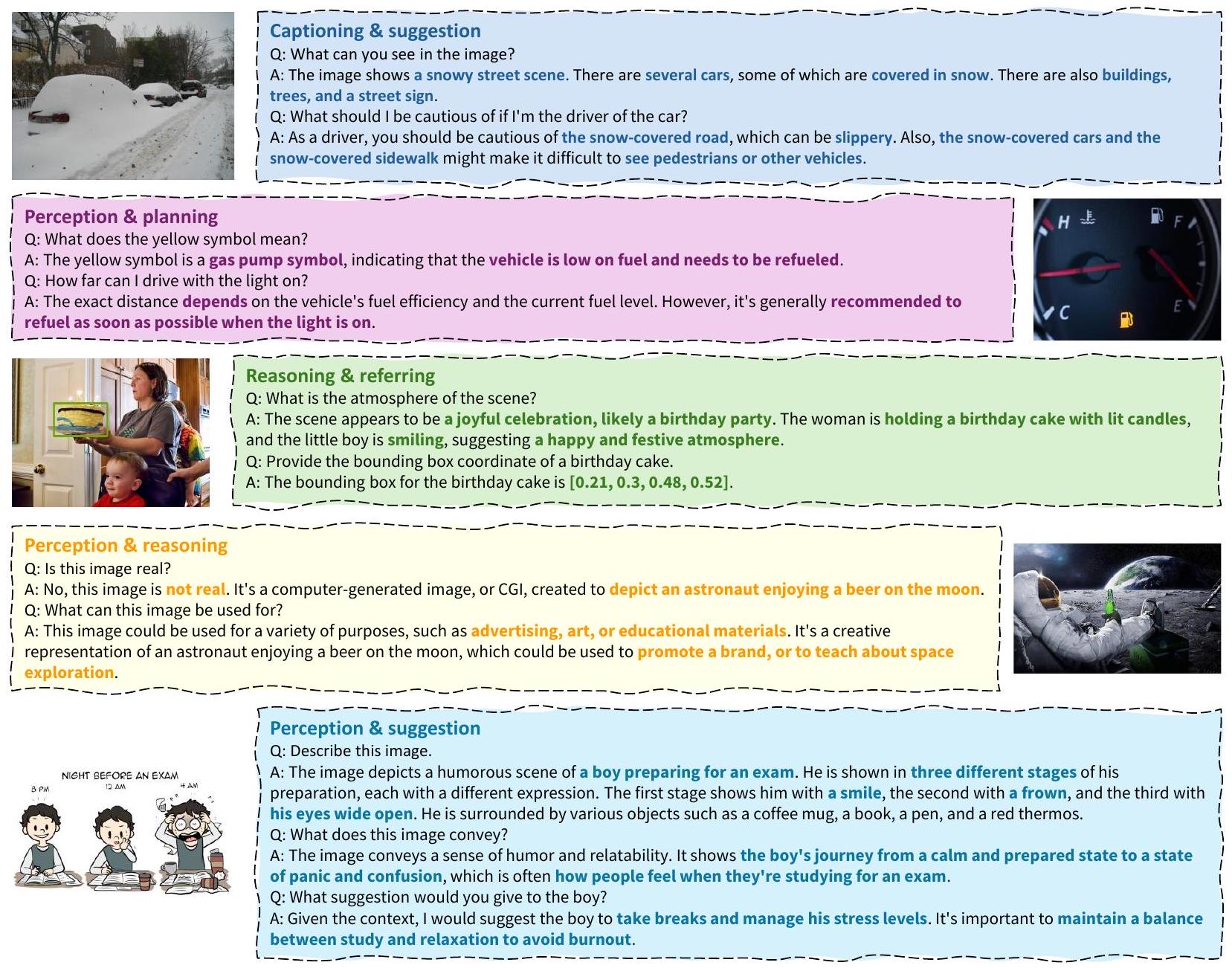 - 다양하고 복합적인 능력 학습: 대화, 복합 추론, 참조 QA, 상세 설명 등 다양한 유형의 데이터를 통해 모델이 단순한 시각적 인지를 넘어 복합적인 추론, 계획, 세부 묘사 능력을 학습할 수 있도록 유도한 점이 인상 깊습니다.