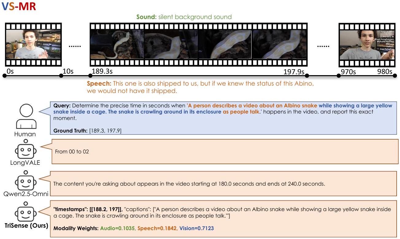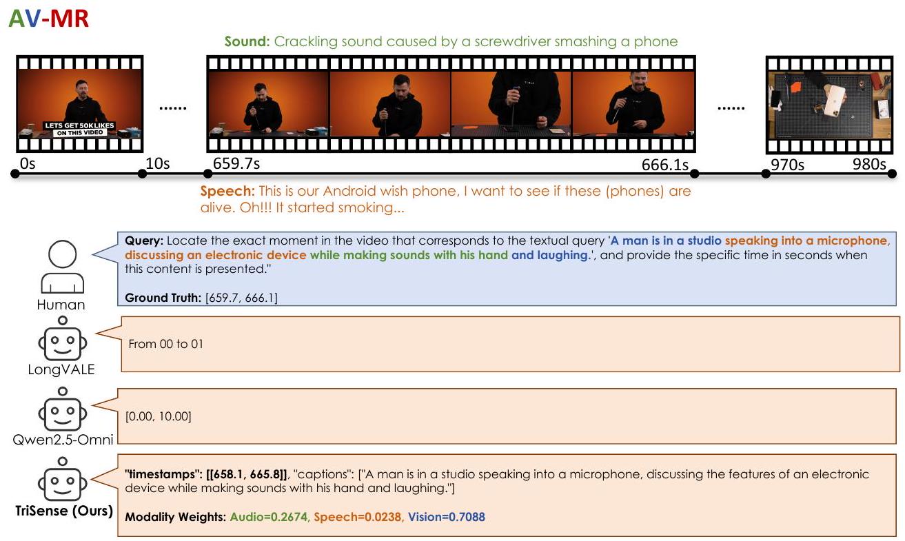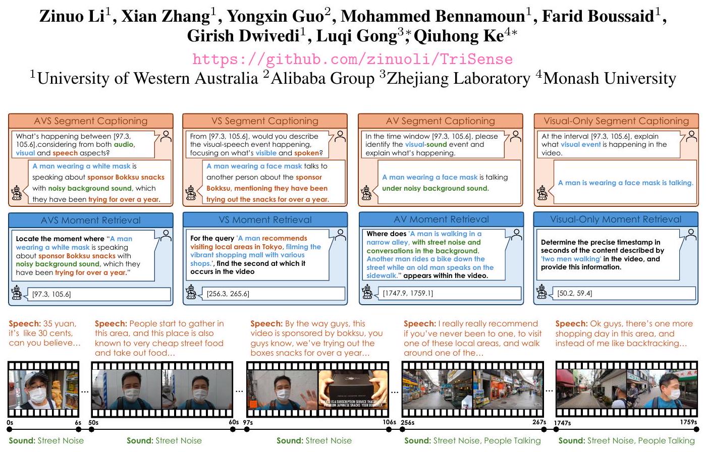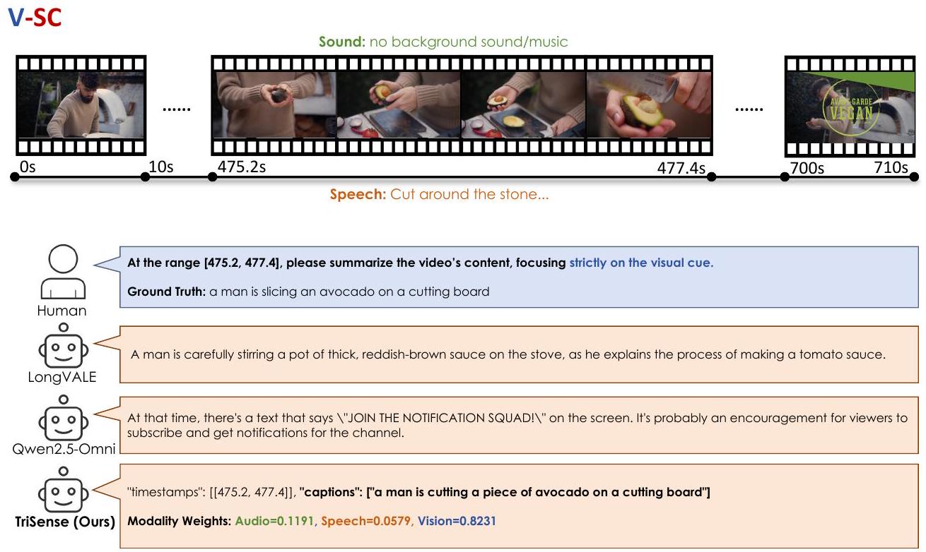 - TriSense-2M 데이터셋에서 기존 비디오 LLM 및 최신 옴니모달 모델(LongVALE, Qwen2.5-Omni)을 세그먼트 캡셔닝 및 순간 검색 작업에서 일관되게 능가했습니다.