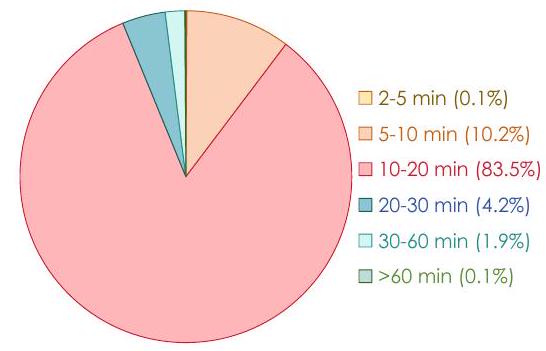 Figure 3: 비디오 길이 분포. 대부분의 비디오는 10-20분 길이(83.5%)로, 장편 시간적 이해를 지원합니다.
