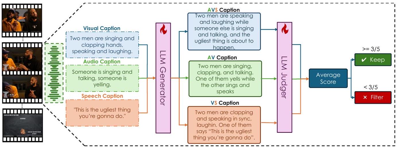 Figure 2: 우리는 시각, 오디오, 음성 스트림에서 얻은 양식별 캡션을 활용하여 데이터셋을 구축하기 위해 자동화된 프레임워크를 사용합니다. 이 과정에는 두 개의 대규모 언어 모델(LLM)이 훈련됩니다: 세 개의 입력 캡션을 다중 모드 출력(AVS, AV, VS)으로 융합하는 생성자(Generator)와 생성된 캡션의 의미적 품질을 평가하는 심판자(Judger). 심판자는 원본 입력과의 정렬을 기반으로 0에서 5 사이의 평균 품질 점수를 할당합니다. 3점 이상인 샘플은 유지되고, 3점 미만인 샘플은 폐기됩니다.
