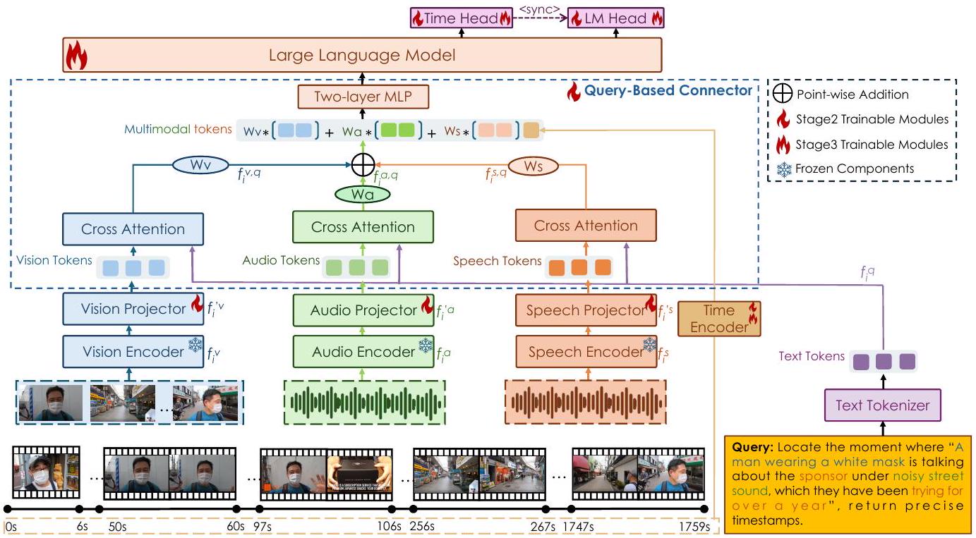 비전-언어 모델링을 넘어, 다중 양식 대규모 언어 모델(MLLM)은 더 풍부한 비디오 분석을 가능하게 하기 위해 시각, 오디오, 음성 양식을 통합합니다. 성능을 향상시키기 위해, 최근의 노력들은 이러한 추가적인 양식을 통합하는 데 초점을 맞추었습니다. 예를 들어, LongVALE [10]은 모든 양식 토큰을 단일 토큰으로 압축하지만, 이는 오디오 컨텍스트나 음성 억양과 같은 미세한 세부 정보의 손실로 이어집니다. 반면에 Qwen2.5-Omni [34]는 텍스트, 이미지, 오디오, 비디오 입력을 처리하는 완전한 종단 간 다중 양식 시스템인 Thinker-Talker 아키텍처를 도입합니다. 시간 차원에 따라 오디오와 비디오를 더 잘 정렬하기 위해, 저자들은 타이밍 인식 위치 인코딩 기술인 TMRoPE를 제안합니다. 그러나 우리 실험에 따르면 이 모델은 여전히 장편 비디오에서의 그라운딩에 어려움을 겪습니다. 이러한 발전에도 불구하고, 많은 기존 모델들은 시각 양식에만 국한되거나 다른 양식의 유연한 조합을 지원하지 못합니다. 이는 시간적 이해 작업, 특히 일부 양식이 부재하거나 잡음이 많을 수 있는 시나리오에서 그 효과를 제한합니다. 이러한 도전 과제들은 강력한 시간적 추론과 일반적인 이해 성능을 유지하면서 다양한 양식 조합을 견고하게 처리할 수 있는 MLLM을 추구하도록 동기를 부여합니다.