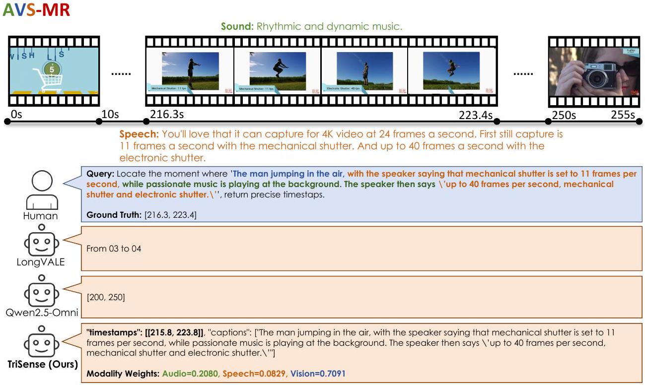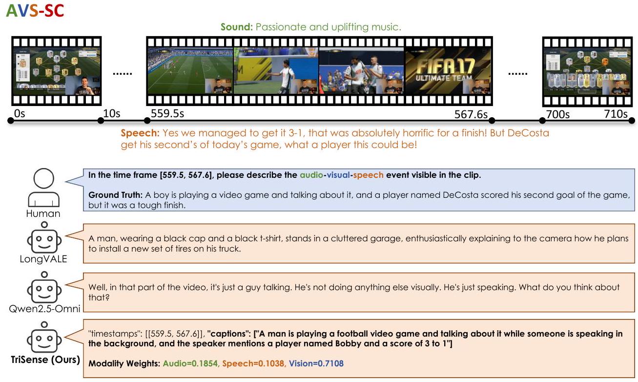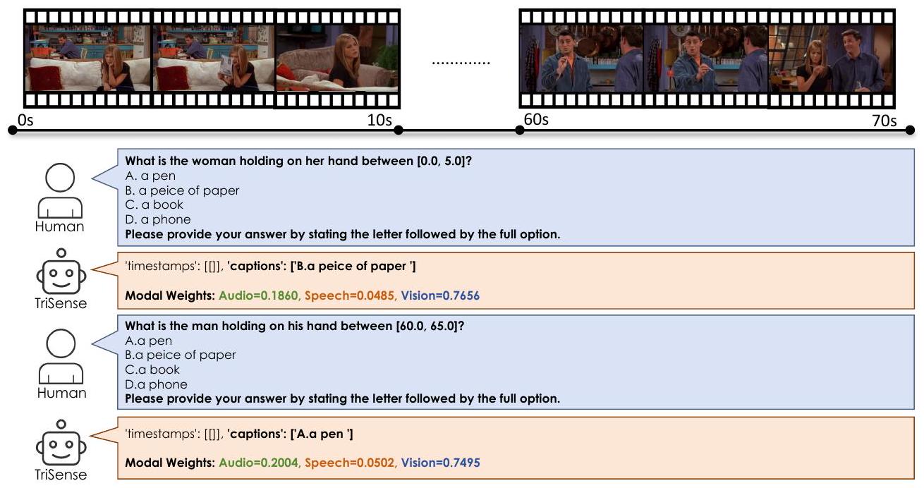 인간은 시각적 및 청각적 단서를 통합하여 비디오 속의 순간들을 자연스럽게 이해합니다. 예를 들어, "과학자가 야생 동물 보존에 대해 열정적으로 연설하고 극적인 오케스트라 음악이 연주되며, 청중은 고개를 끄덕이고 박수를 친다"와 같은 장면을 비디오에서 찾아내려면 시각, 오디오, 음성 신호를 동시에 처리해야 합니다. 그러나 기존 모델들은 오디오 정보를 효과적으로 융합하고 해석하는 데 어려움을 겪는 경우가 많아, 포괄적인 비디오 시간적 이해 능력에 한계가 있습니다. 이를 해결하기 위해, 우리는 시각, 오디오, 음성 양식을 통합하여 전체적인 비디오 시간적 이해를 위해 설계된 삼중 양식 대규모 언어 모델인 TriSense를 제시합니다. TriSense의 핵심은 입력 쿼리에 따라 양식 기여도를 적응적으로 재조정하는 Query-Based Connector로, 양식 누락 시에도 견고한 성능을 보장하고 사용 가능한 입력의 유연한 조합을 가능하게 합니다. TriSense의 다중 양식 능력을 지원하기 위해, 우리는 미세 조정된 LLM으로 구동되는 자동화된 파이프라인을 통해 생성된 2백만 개 이상의 고품질 큐레이션 샘플로 구성된 데이터셋인 TriSense-2M을 소개합니다. TriSense-2M은 장편 비디오와 다양한 양식 조합을 포함하여 광범위한 일반화를 촉진합니다. 여러 벤치마크에 걸친 광범위한 실험은 TriSense의 효과와 다중 양식 비디오 분석을 발전시킬 잠재력을 보여줍니다. 코드와 데이터셋은 공개될 예정입니다.
