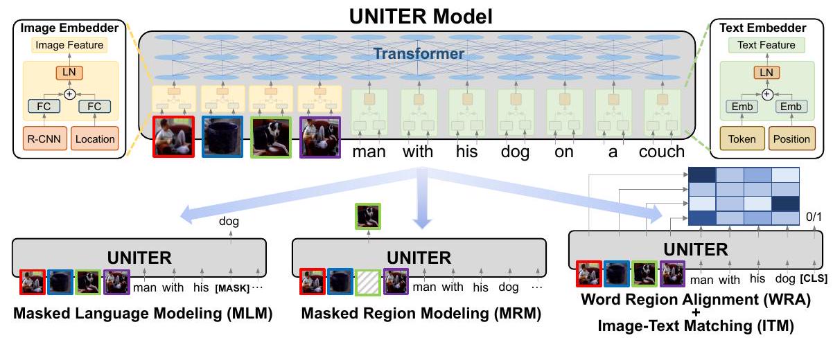 UNITER는 Transformer를 핵심으로 하는 단일 스트림(single-stream) 아키텍처를 사용하며, 대규모 이미지-텍스트 데이터셋(COCO, Visual Genome, Conceptual Captions, SBU Captions)으로 사전 학습된다. 모델은 이미지 영역(시각적 특징 및 바운딩 박스)과 텍스트 단어(토큰 및 위치)를 Image Embedder와 Text Embedder를 통해 공통 임베딩 공간으로 인코딩한 후, Transformer 모듈을 통해 cross-modality contextualized embedding을 학습한다.네 가지 주요 사전학습 태스크는 다음과 같다: