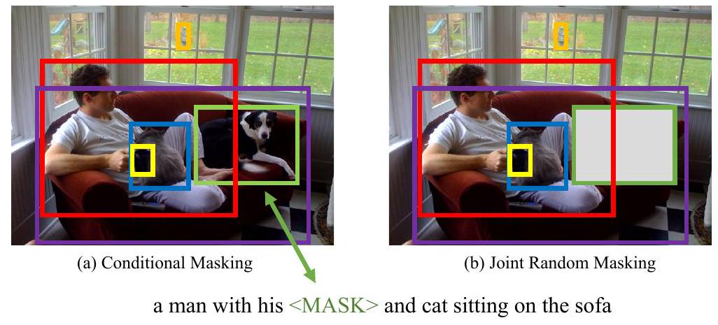 우리는 [47, 29]에서 사용된 joint random masking 방식에 비해 우리가 제안하는 conditional masking의 장점을 추가로 논의한다. 직관적으로, 우리의 conditional masking은 두 가지 양식(modality)에 걸쳐 개체(영역 및 단어)의 잠재적 정렬(latent alignment)을 더 잘 학습한다. Figure 5는 "man with his dog and cat sitting on a sofa"라는 문장과 함께 제시된 이미지 예시를 보여준다. conditional masking을 사용하면, 개의 영역이 마스킹되었을 때, 우리 모델은 주변 영역과 전체 문맥(full sentence)을 기반으로 해당 영역이 개임을 추론할 수 있어야 하며 (Figure 5(a)), 그 반대도 마찬가지이다. 그러나 joint masking 구현에서는 개의 영역과 "dog"라는 단어가 동시에 마스킹될 수 있다 (Figure 5(b)). 이러한 경우, 모델은 맹목적으로 예측해야 하므로 잘못된 정렬(mis-alignment)로 이어질 수 있다.