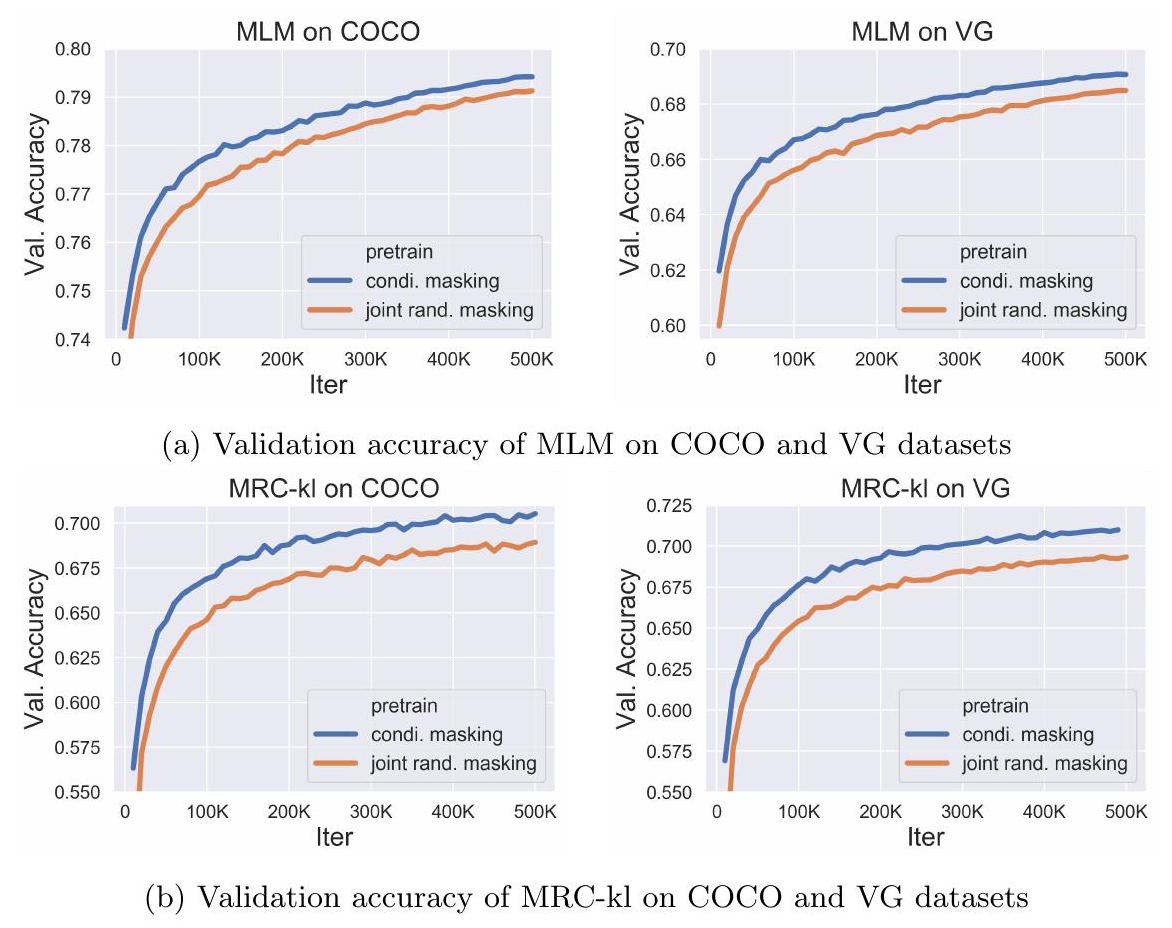 이러한 직관을 검증하기 위해, Figure 6에서 사전학습 중 MLM 및 MRC-kl의 validation curve를 보여준다. 각 하위 그림은 UNITER의 사전학습 중 conditional masking과 joint random masking을 적용했을 때의 비교를 나타낸다. MLM accuracy는 UNITER가 마스킹된 단어를 얼마나 잘 재구성하는지를 측정하며, MRC-kl accuracy는 UNITER가 마스킹된 영역을 얼마나 잘 분류하는지를 측정한다. Figure 6에서 볼 수 있듯이, 두 경우 모두 우리의 conditional masking이 joint random masking보다 더 빠르게 수렴하고 더 높은 최종 정확도를 달성한다. 또한, 본 논문의 Table 2 (10행 및 11행)는 우리의 conditional masking이 fine-tuned downstream task에서도 더 나은 성능을 보임을 보여준다.