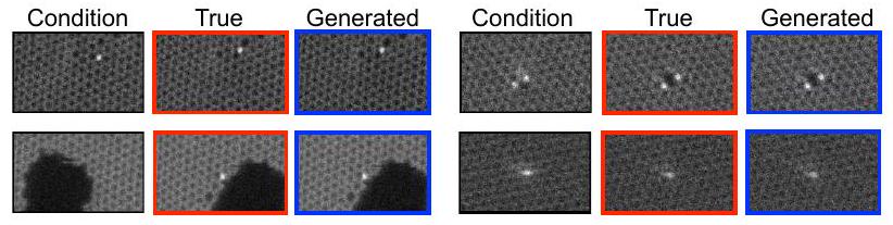 Figure 10: 원자 수준 다음 프레임 예측 (Atomic-Level Next-Frame Prediction). 전자 현미경의 전자빔에 의해 자극된 그래핀 시트 위의 실리콘 원자의 시각적 동역학을 반영하는 조건부 프레임, 실제 다음 프레임, 그리고 생성된 다음 프레임. 생성 모델은 높은 충실도로 시각적 동역학을 모델링할 수 있다.