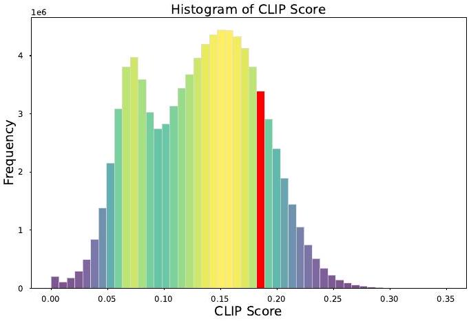 우리는 중국어 이미지-텍스트 쌍에서 CLIP score를 계산하기 위해 **Chinese-CLIP (Yang et al., 2022)**을 사용한다. Chinese CLIP 모델은 데이터 필터링 및 텍스트 인코딩을 위해 여러 중국어 text-to-image 모델에서 사용되어 왔다 (Wang et al., 2022a; Liu et al., 2023b; Yang et al., 2023). 우리는 중국어 text-to-image 모델 학습 시 **Taiyidiffusion의 데이터 볼륨 및 필터링 기준(CLIP score 포함)**을 참고하였다. 우리는 Wukong 데이터셋의 캡션을 수동으로 확인하였다. 그 결과, Wukong의 텍스트 콘텐츠 전반적인 품질이 만족스럽지 않음을 발견하였다. 낮은 CLIP score에 대한 몇 가지 발견 사항은 다음과 같다: