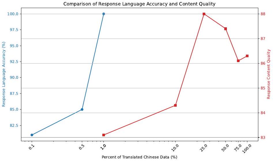 - 중국어 원어민 데이터셋과 번역된 중국어 데이터셋을 통합하면 모델 성능에 미미한 개선이 나타났으나, 소량의 대상 언어 데이터가 응답 언어를 조정하는 데 중요함을 확인했습니다.
