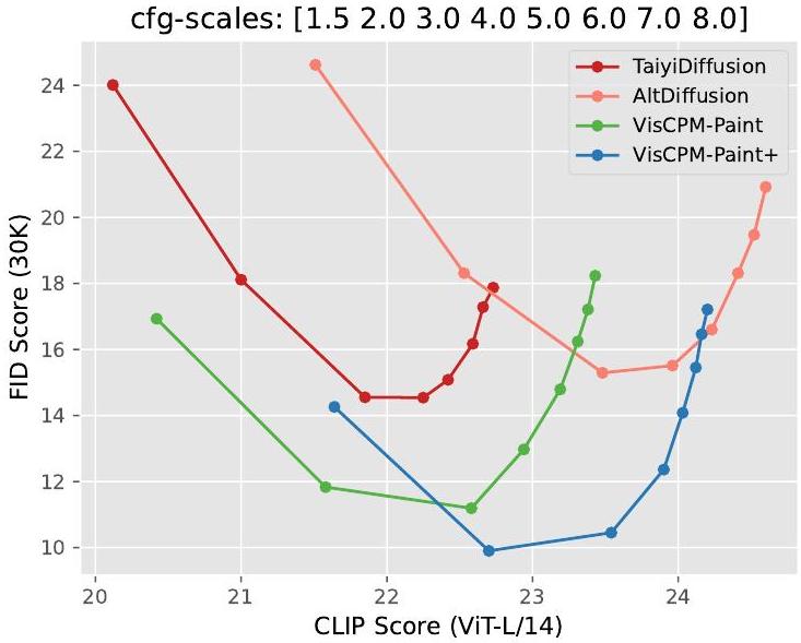 충실도(fidelity)와 정렬(alignment) 간의 trade-off를 시각화하기 위해, Figure 6은 다양한 classifier guidance scale에서 FID와 CLIP score의 곡선을 보여준다. 결과는 VISCPM-Paint와 **VISCPM-Paint+**가 이미지 품질과 의미론적 정렬 간의 균형 측면에서 전반적으로 우수한 성능을 제공함을 나타낸다. AltDiffusion의 CLIP score가 VISCPM-Paint 및 VISCPM-Paint+보다 약간 우수하지만, AltDiffusion의 FID는 현저히 낮다. 생성된 이미지의 **차선책 품질(sub-optimal quality)**은 아래의 인간 평가에서 보여지듯이 실제 사용에 영향을 미칠 것이다.