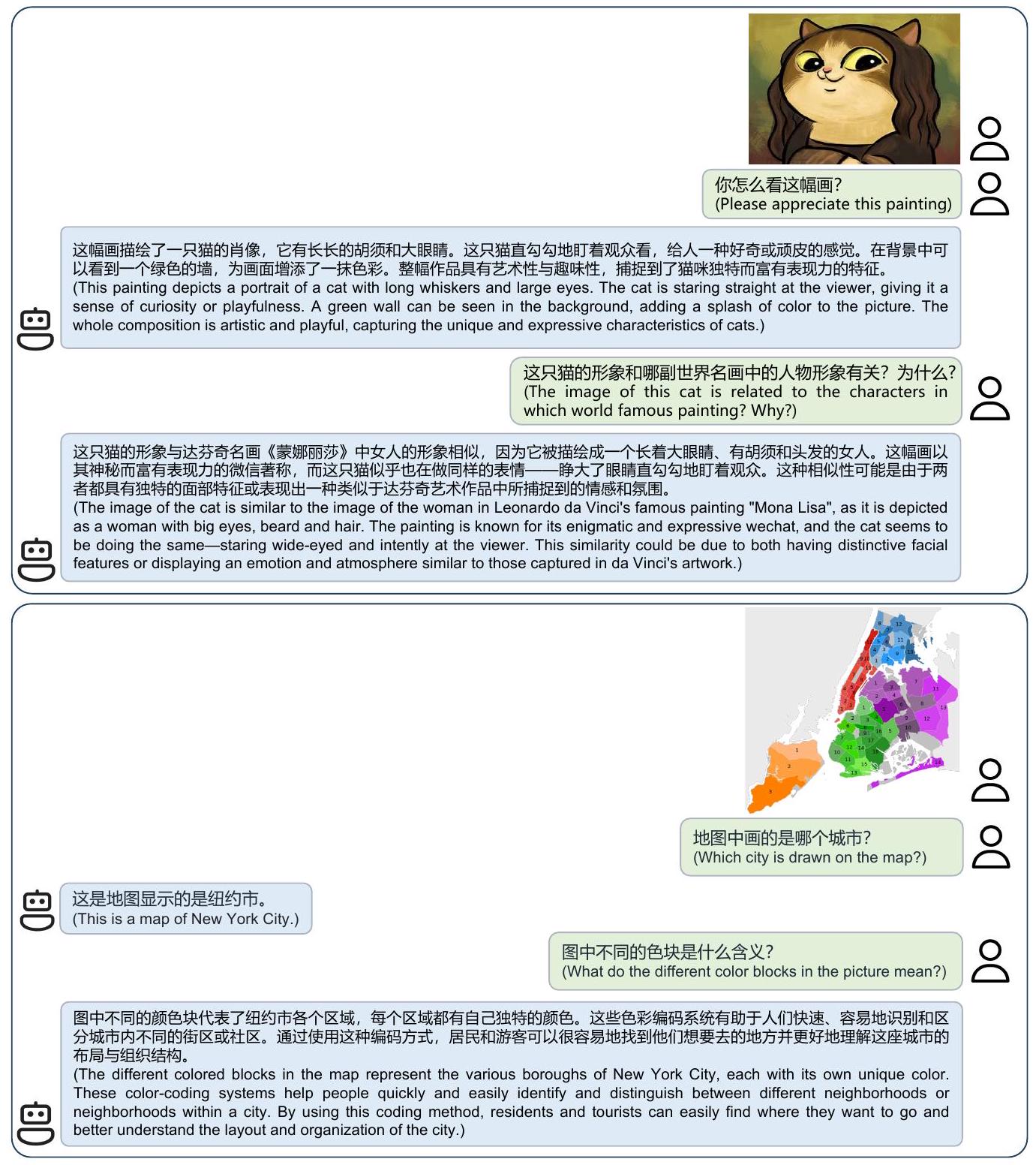 Figure 7: VISCPM-Chat의 중국어 멀티모달 대화 사례. VISCPM-Chat은 초현실주의 스타일로 각색되었지만 모나리자와 같은 예술 작품과 뉴욕시의 상세하고 얼룩진 지도를 인식할 수 있다.