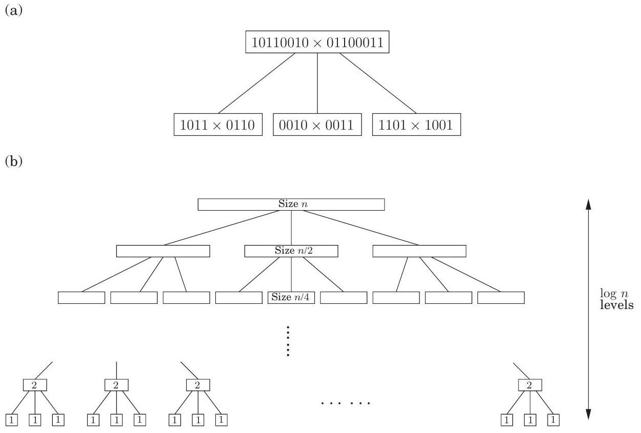 Figure 2.2 분할 정복 정수 곱셈. (a) 각 문제는 세 개의 하위 문제로 나뉜다. (b) 재귀의 수준.