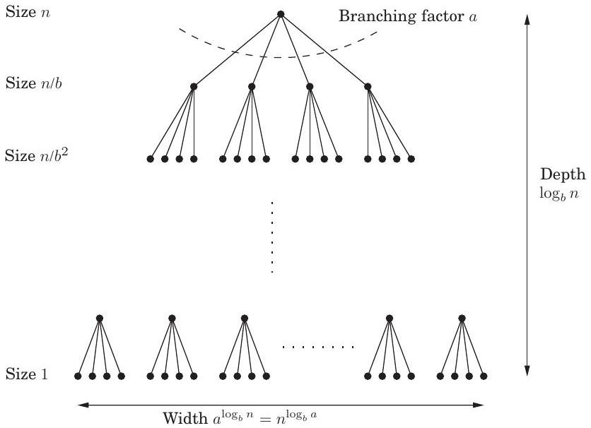 다음으로, 하위 문제의 크기가 각 재귀 수준마다 인자만큼 감소하므로, 수준 후에 **기저 사례(base case)**에 도달한다는 점에 주목하자. 이것이 **재귀 트리(recursion tree)**의 높이이다. **분기 인자(branching factor)**는 이므로, 트리의 번째 수준은 각각 크기 인 개의 하위 문제로 구성된다(그림 2.3). 이 수준에서 수행되는 총 작업량은 다음과 같다.