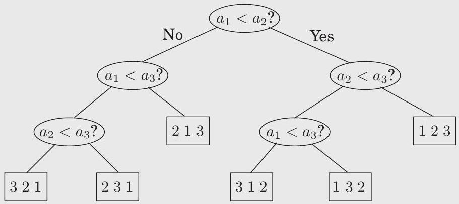 정렬 알고리즘은 트리 형태로 나타낼 수 있다. 다음 그림의 트리는 세 개의 요소 로 구성된 배열을 정렬한다. 이 트리는 과 를 비교하는 것으로 시작하며, 만약 첫 번째 요소가 더 크면 와 비교하고, 그렇지 않으면 와 를 비교한다. 이러한 방식으로 진행하여 결국 리프 노드에 도달하게 되며, 이 리프 노드에는 세 요소의 실제 순서가 1, 2, 3의 permutation으로 표시된다. 예를 들어, 인 경우 "213"으로 레이블된 리프 노드를 얻게 된다.