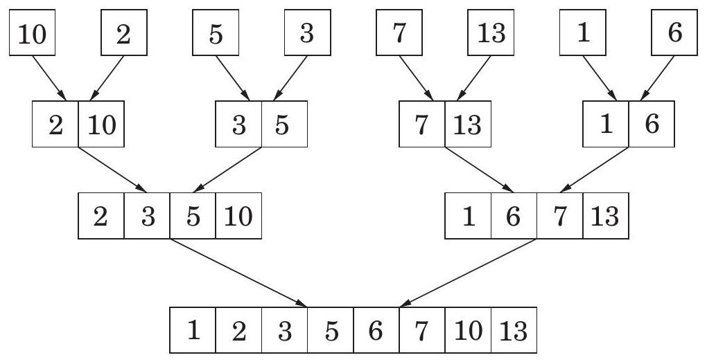 Figure 2.4 mergesort의 병합 연산 시퀀스. Input: | 10 | 2 | 5 | 3 | 7 | 13 | 1 | 6 | | :--- | :--- | :--- | :--- | :--- | :--- | :--- | :--- |