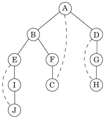 방향 그래프의 경우를 더 자세히 분석하기 위해, 트리의 노드들 간의 중요한 관계를 나타내는 용어를 사용하는 것이 도움이 된다. 는 탐색 트리의 **루트(root)**이며, 다른 모든 노드는 의 **자손(descendant)**이다. 마찬가지로, 는 를 자손으로 가지며, 반대로 는 이 세 노드의 **조상(ancestor)**이다. 이러한 가족 비유는 더 나아가 가 의 **부모(parent)**이고, 는 의 **자식(child)**이라는 식으로 이어진다.