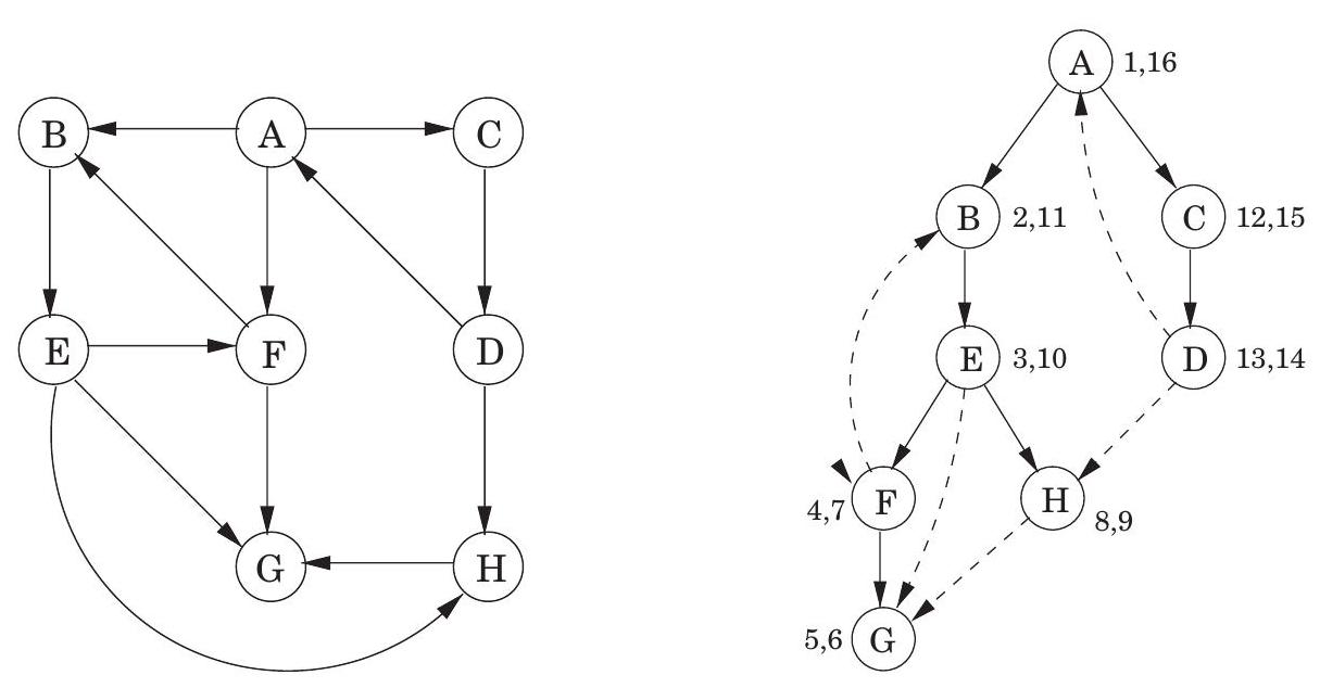 방향 그래프를 **강하게 연결된 구성 요소(strongly connected components)**로 분해하는 것은 매우 유익하고 유용하다. 다행히도, **깊이 우선 탐색(depth-first search)**을 추가로 활용하여 선형 시간 안에 이를 찾을 수 있다. 이 알고리즘은 우리가 이미 보았지만 이제 더 자세히 살펴볼 몇 가지 속성을 기반으로 한다.