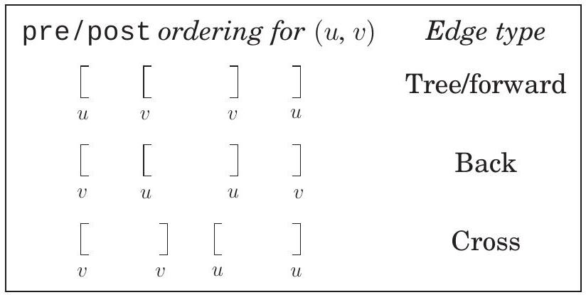 자손의 경우는 대칭적이다. 가 의 자손인 것은 가 의 조상인 경우와 동일하기 때문이다. 그리고 간선 범주가 전적으로 조상-자손 관계에 기반하므로, 이들 또한 pre 및 post 번호에서 읽어낼 수 있다. 다음은 간선 ()에 대한 다양한 가능성을 요약한 것이다:
