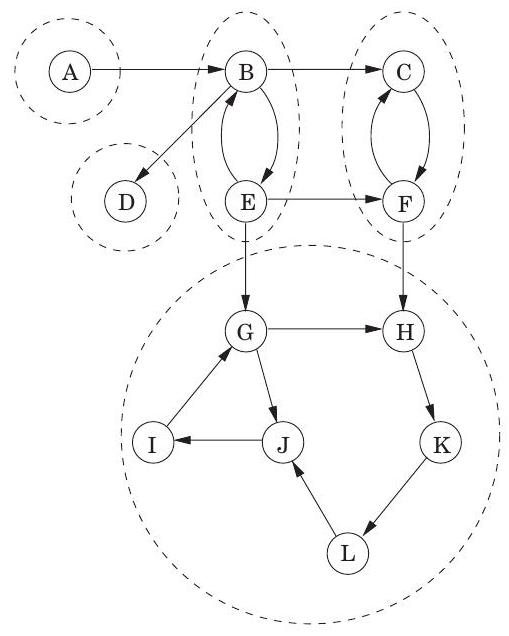 이 관계는 를 강하게 연결된 컴포넌트라고 부르는 서로소 집합으로 분할한다(연습문제 3.30). 그림 3.9(a)의 그래프에는 다섯 개의 강하게 연결된 컴포넌트가 있다.