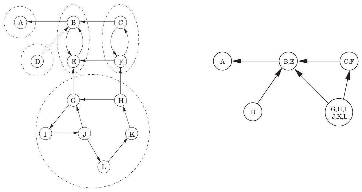 그림 3.9 (a) 방향 그래프와 그 강하게 연결된 컴포넌트(strongly connected components). (b) 메타 그래프(meta-graph).