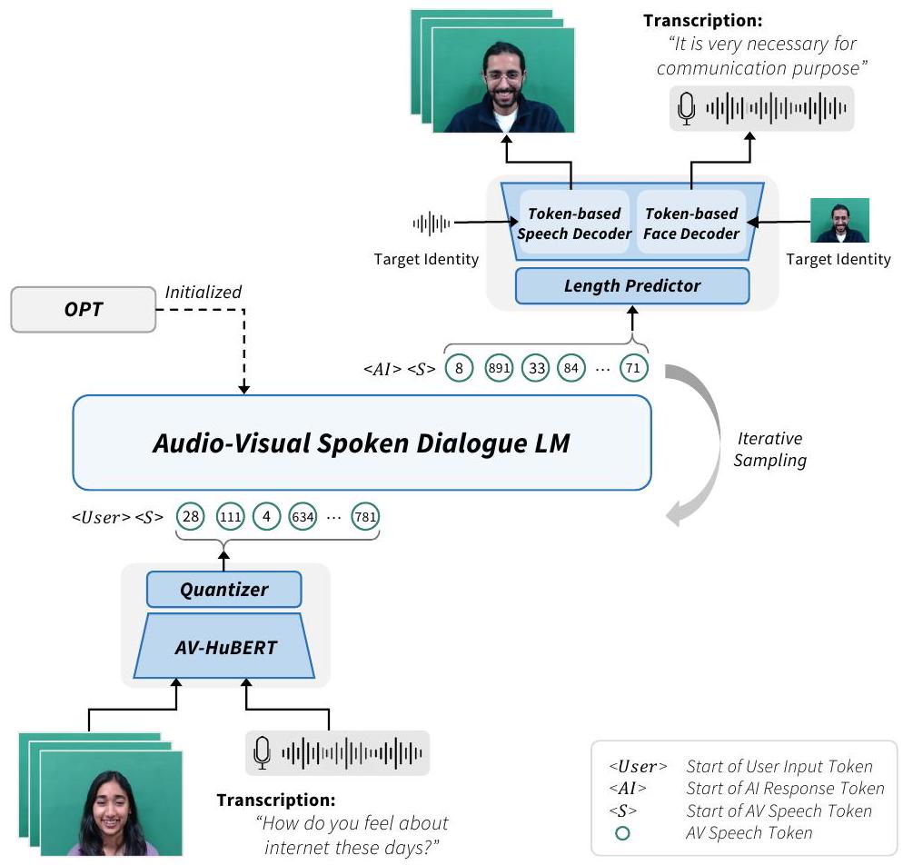 MultiDialog 데이터셋을 기반으로, 우리는 사용자 입력으로 시청각 음성을 직접 처리하고 출력 응답으로 시청각 음성을 생성할 수 있는 최초의 시청각 음성 대화 모델을 제안합니다. 이산화된 음성 토큰을 사용하는 직접 음성 대화 모델의 최근 성공에 동기 부여 받아 (Nguyen et al., 2023b; Zhang et al., 2023a), 우리는 자기 지도 모델 (Shi et al., 2021)에서 시청각 음성 특징을 양자화하여 추출한 시청각 (AV) 음성 토큰을 소개합니다. AV 음성 토큰을 의사 텍스트로 활용하여, 우리는 사전 훈련된 대규모 언어 모델 (LLM) (Zhang et al., 2022)에 AV 음성을 통합하고 공동 음성-텍스트 사전 훈련을 통해 이를 통합합니다. 응답은 또한 AV 음성 토큰으로 반환되며, 이는 시스템과의 직접적인 상호 작용을 위해 출력으로 말하는 얼굴 비디오로 합성됩니다.