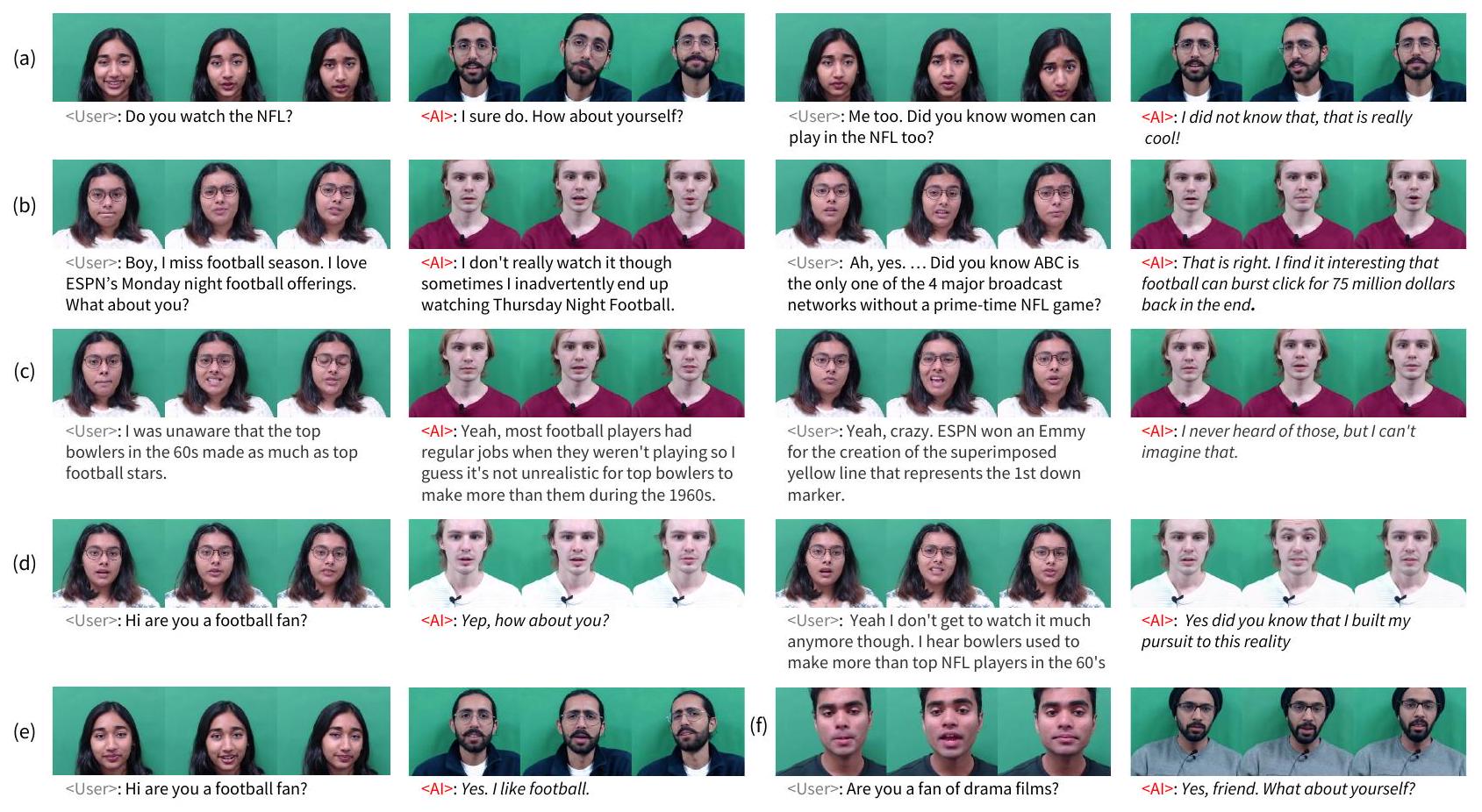 그러나 사람들이 얼굴을 마주하고 소통할 때, 우리는 음성 단어와 비언어적 단서(즉, 표정, 제스처, 감정)를 처리하기 위해 대화 상대의 오디오 정보뿐만 아니라 시각 정보도 활용합니다 (Petridis et al., 2018; Hong et al., 2023). 이러한 멀티모달 정보는 음성 내용과 화자의 의도에 대한 이해를 향상시킵니다. 더욱이, 오디오에 대한 시각적 상대가 있으면 실제 얼굴을 마주한 대화 경험을 시뮬레이션하여 사용자가 더 연결되고 참여하는 느낌을 받을 수 있습니다.