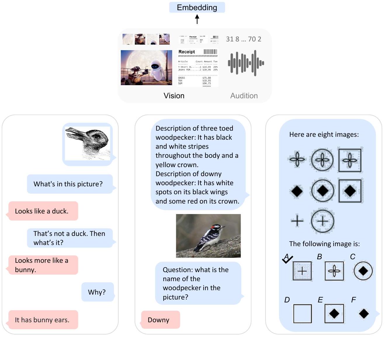 (i) 언어 이해, 생성, 심지어 OCR-free NLP (문서 이미지를 직접 입력으로 사용), (ii) 멀티모달 대화, 이미지 캡셔닝, visual question answering을 포함한 인지-언어(perception-language) task, (iii) 설명(텍스트 지시를 통한 분류 지정)을 포함한 이미지 인식과 같은 비전 task.