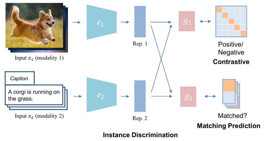 - Instance Discrimination: 각 인스턴스를 구별하거나, 두 모달리티 샘플이 동일한 인스턴스에서 왔는지 예측하는 방식 (대조 학습, 매칭 예측).