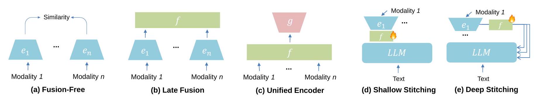 - 스티칭(Stitching)을 통한 융합: 별도로 사전 훈련된 단일 모달 모델을 고정된 상태로 통합하고, 추가적인 학습 가능한 "스티칭" 모듈을 통해 양식 간 상호 작용을 중재 (얕은 스티칭, 깊은 상호 작용 스티칭).