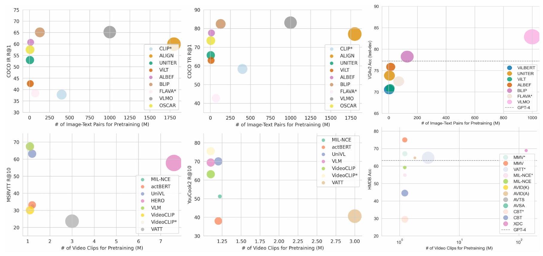 Fig. 7. 다운스트림 작업에 대한 이미지-텍스트 모델 및 멀티모달 비디오 모델의 결과. 각 산점도의 크기는 추정된 모델 매개변수의 수에 해당합니다. 상단 행, COCO 데이터셋에서 텍스트-이미지 및 이미지-텍스트 검색의 recall@1, VQAv2 데이터셋에서 VQA의 정확도. 별표(*)가 있는 방법은 제로샷 성능을 나타내고, 다른 방법은 미세 조정 결과를 보여줍니다. 하단 행, MSRVTT 및 YouCook2 데이터셋에서 비디오 검색의 recall@10, HMDB 데이터셋에서 행동 인식의 정확도. 비디오 검색 작업의 경우 별표는 미세 조정 성능을 나타내고 별표가 없는 방법은 제로샷 성능을 나타냅니다. 행동 인식 작업의 경우 그 반대입니다. VQAv2 및 HMDB 데이터셋에 대한 GPT-4 제로샷 성능도 참고용으로 포함했습니다.