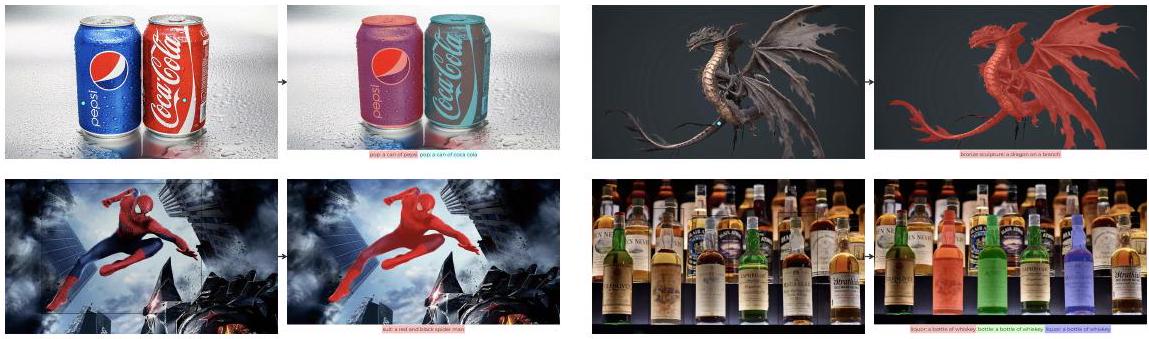 Open-world 지식. Fig. 5는 open-world 시나리오에서 도전 과제를 제기하는 예시 인스턴스를 보여준다. 어휘 설계의 주관적인 특성 때문에, 'pepsi', 'cocacola', 'dragon', 'spider-man', 'whisky'와 같은 선별된 개념들은 검색(즉, 분류)을 통해 선택하기 어렵다. 그러나 우리 모델은 이러한 개념 관련 인스턴스를 능숙하게 처리하여 open-world 지식을 다룰 수 있는 능력을 보여준다.