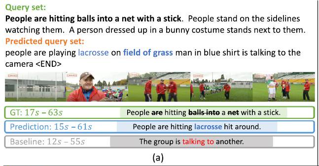 Fig. 6에서는 우리가 제안하는 방법이 query set의 예측을 완료하고, global clue를 추출하며, 이 clue를 활용하여 재구성 프로세스를 안내하는 방식을 보여준다. 처음 세 가지 예시(a, b, c)에서, 우리는 제안된 모델이 현재 query와 비디오를 기반으로 전체 query set을 정확하게 예측하여, (a)의 "lacrosse", (b)의 "skateboard", (c)의 "throwing"과 같은 합리적인 global clue를 포착하는 것을 볼 수 있다. Global clue를 기반으로, 우리 모델은 baseline보다 비디오 콘텐츠를 더 효과적으로 이해하고 더 견고한 재구성을 수행할 수 있다. 이 예시들을 통해, 비디오 콘텐츠가 query set에 따라 중요한 주요 스토리라인을 가질 때, 우리 모델이 관련 정보를 효과적으로 포착하고 이를 재구성 모델에 중요한 지침을 제공하는 global clue로 추출한다는 것을 알 수 있다.